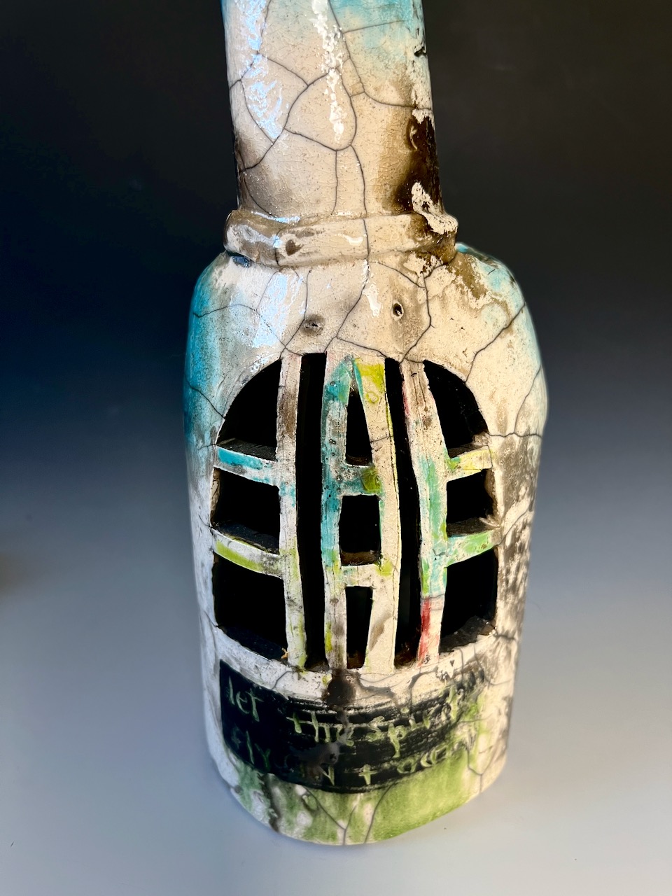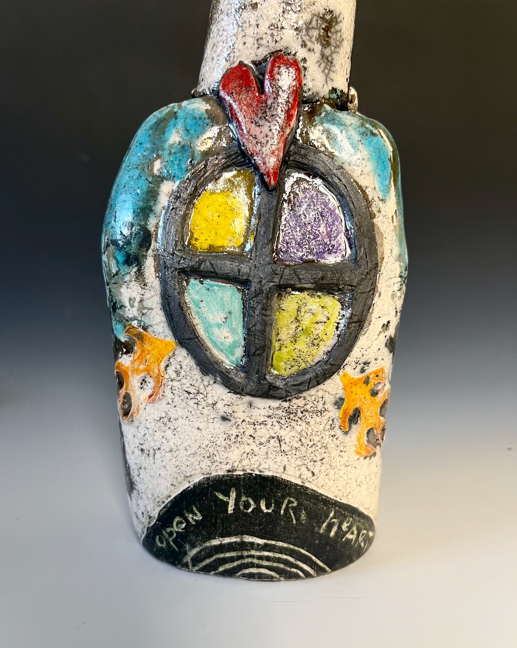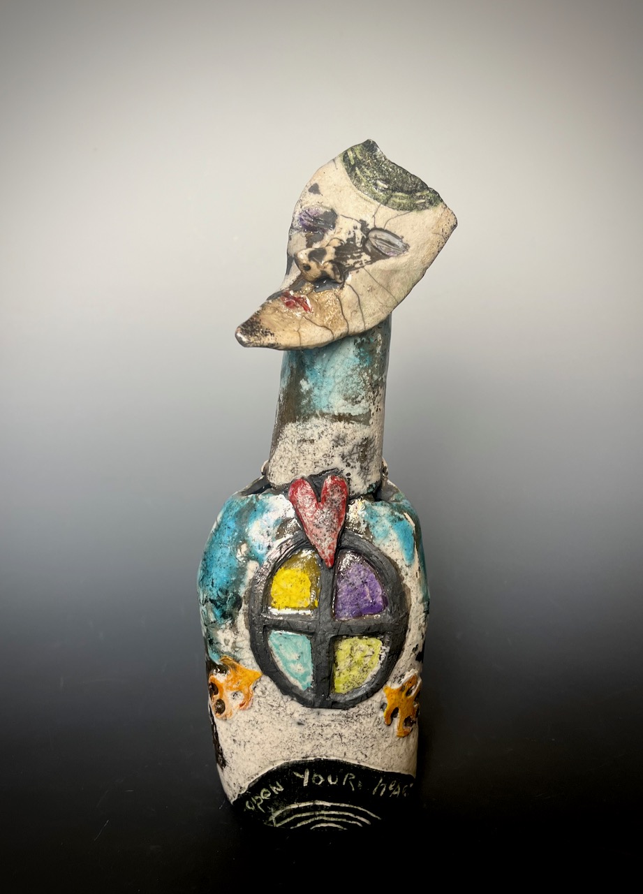 A small standing sculpture with a pieceful austere face. The body is embellisghed with heart and “stained glass” window on the front, as well as flames and the words “open your heart.” On the back window panes are carved out and the inscription “let the spirits fly in and out” is barely legible beneath the raku distresses.