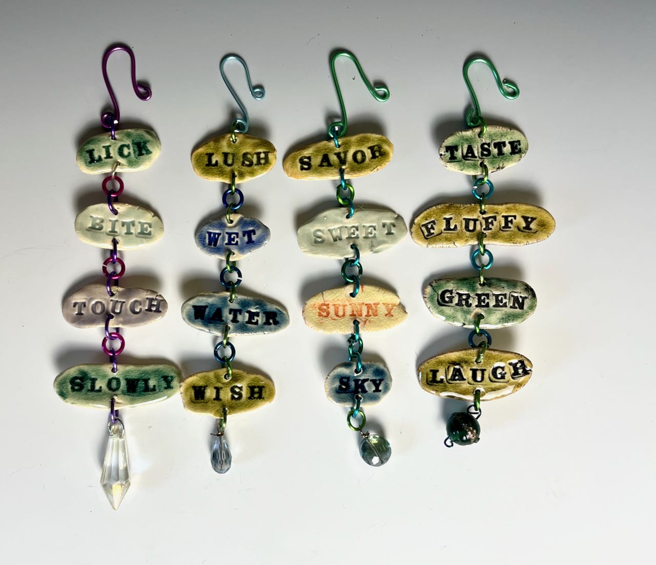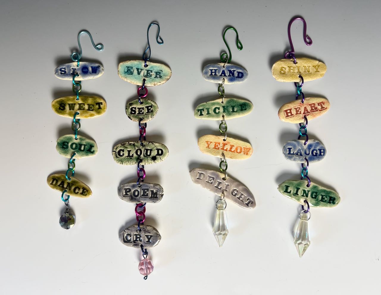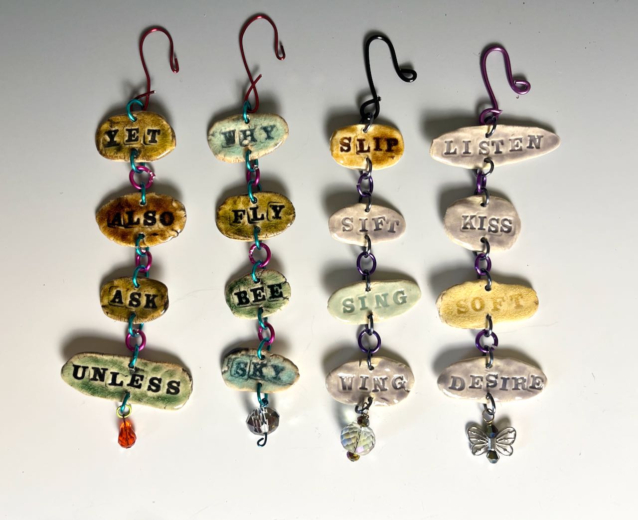 Genrated from the same principle as refrigerator poetry, I make lots of single words then piece them together to create small poems. Each hanging poem is approximately 1.25″ x 5″