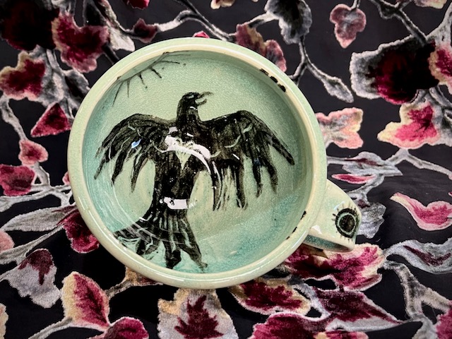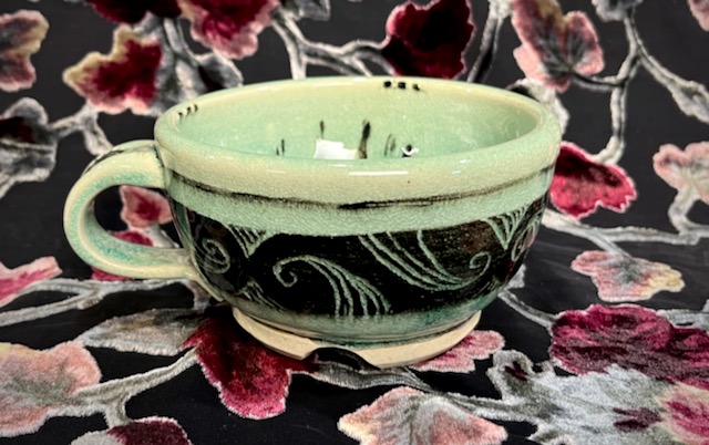 Black’N’Blue Ware functional ceramics are hand-crafted and individually hand-painted. Each design is improvised in the moment, painted and carved freehand from a database of design motifs in my brain and inscribed with a message that marks the moment. My work is fluid and rough hewn by nature, the quirks and imperfections are inherent to the work. Traces of the making process are intentionally left creating an intimacy between maker and user. I strive to make cups and bowls that are comfortable in the hand and hope for them to become “favorites” for daily use. Prices reflects the hours that go into decorating each piece, the cost of materials and power to run the kilns. Each piece is fired twice. Pieces with gold luster are fired three times. While pieces are dishwasher safe, hand washing is recommended. Microwave safe except for pieces with gold luster.