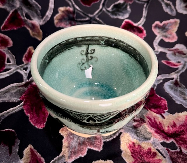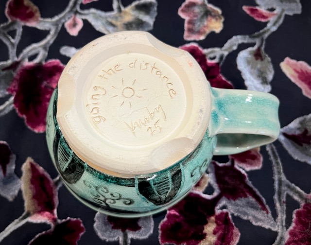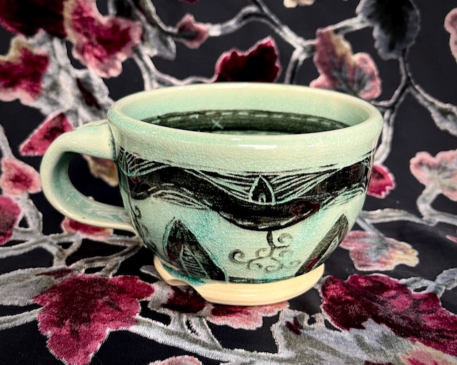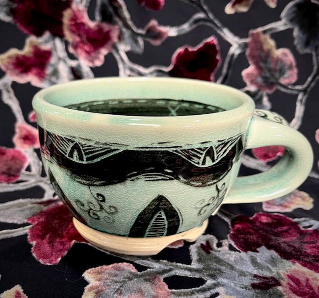Black’N’Blue Ware functional ceramics are hand-crafted and individually hand-painted. Each design is improvised in the moment, painted and carved freehand from a database of design motifs in my brain and inscribed with a message that marks the moment. My work is fluid and rough hewn by nature, the quirks and imperfections are inherent to the work. Traces of the making process are intentionally left creating an intimacy between maker and user. I strive to make cups and bowls that are comfortable in the hand and hope for them to become “favorites” for daily use. Prices reflects the hours that go into decorating each piece, the cost of materials and power to run the kilns. Each piece is fired twice. Pieces with gold luster are fired three times. While pieces are dishwasher safe, hand washing is recommended. Microwave safe except for pieces with gold luster.