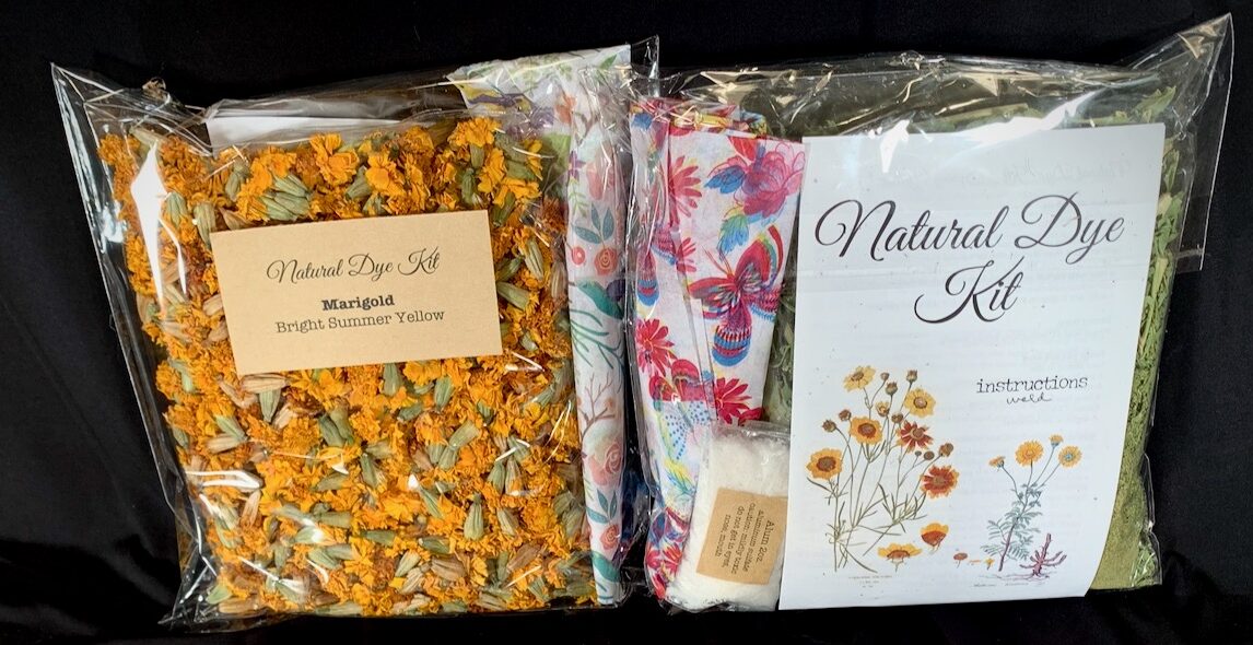 Natural dye kit includes plant materials for dying, alum fixitive and instructions booklet. For dying natural animal fibers, wool, angora, alpaca, cashmere, silk.