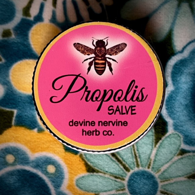 Propolis is the sticky substance that bees make from from tree sap and other plant resins.  It is anti-bacterials and wound healing and is used by the bees to clean and sanitize the comb and seal the hive.  Propolis salve has great healing properties for scrapes, cut and small infections.  .5 oz tin