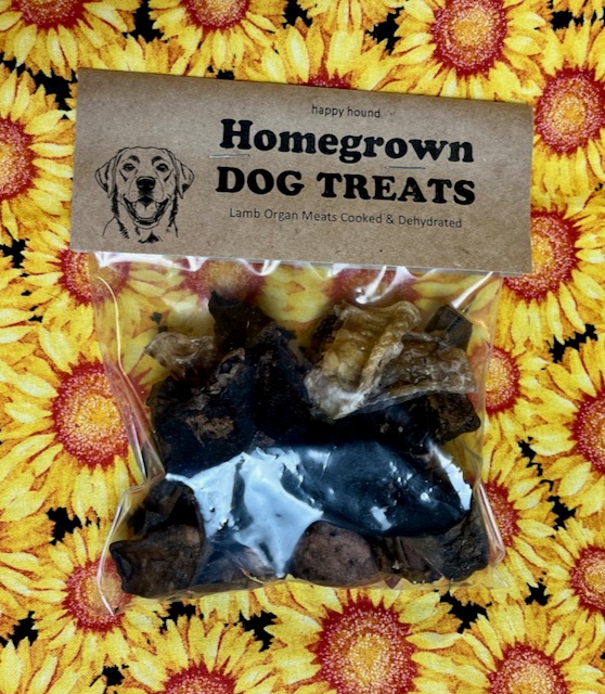 Dog treats made from sustainably raised lamb organs. Lung, trachea, liver, pancreas. Fully cooked and then dehydrated.  Recommended for medium and large dogs but can be broken into pieces for smaller dogs.  Can also be soaked in warm water to rehydrate and soften.  Hide them from the cats too!
