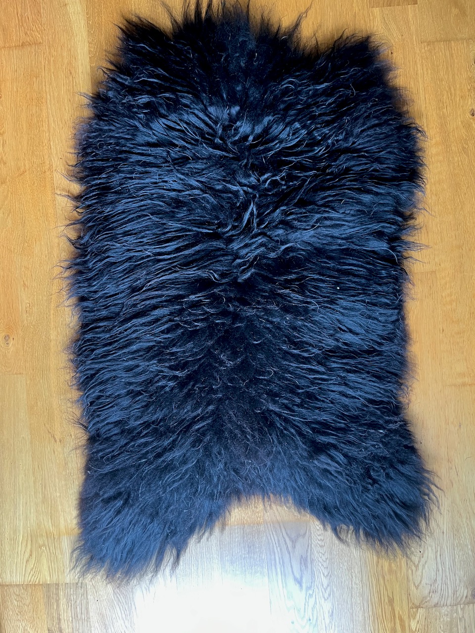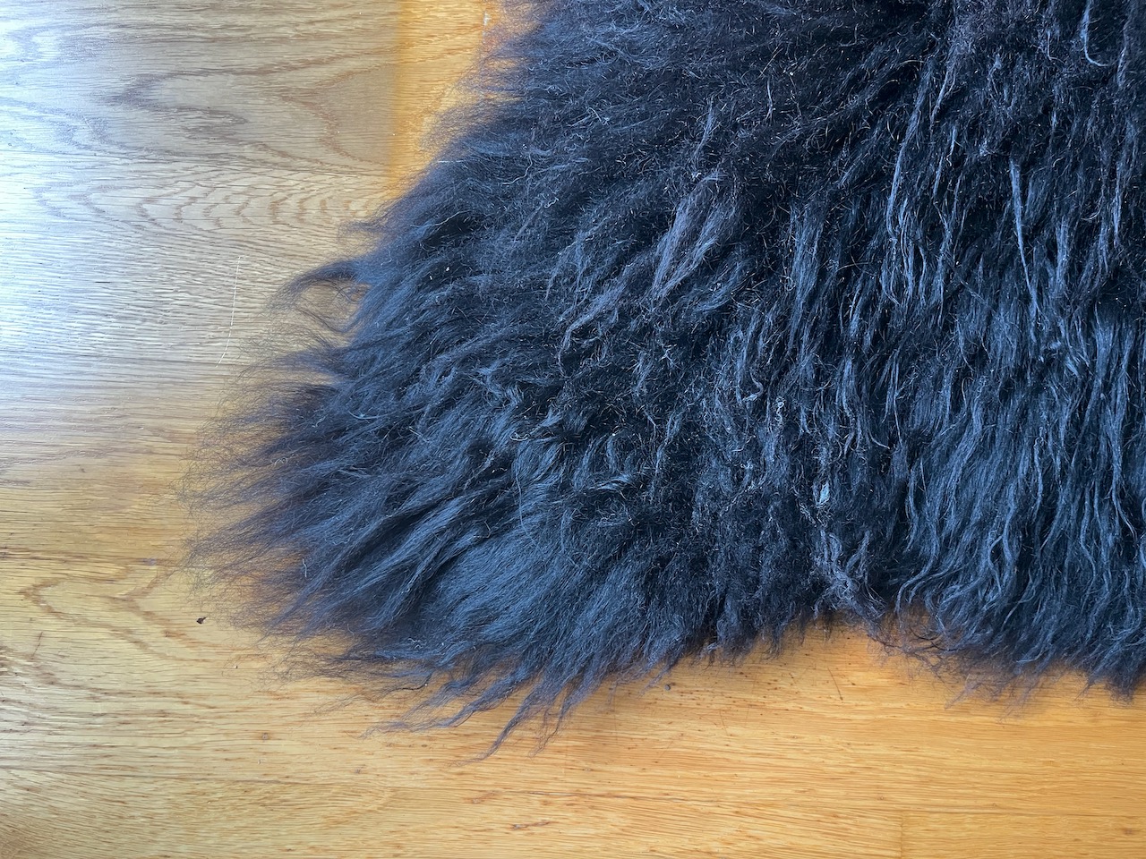 Description: A true black pelt with extra long straight fibers and a blocky shape. Silky and lustrous. Two small holes in the leather, 1 fleabite and another 1.5”. Not visible from front. First and last picture most true to color
